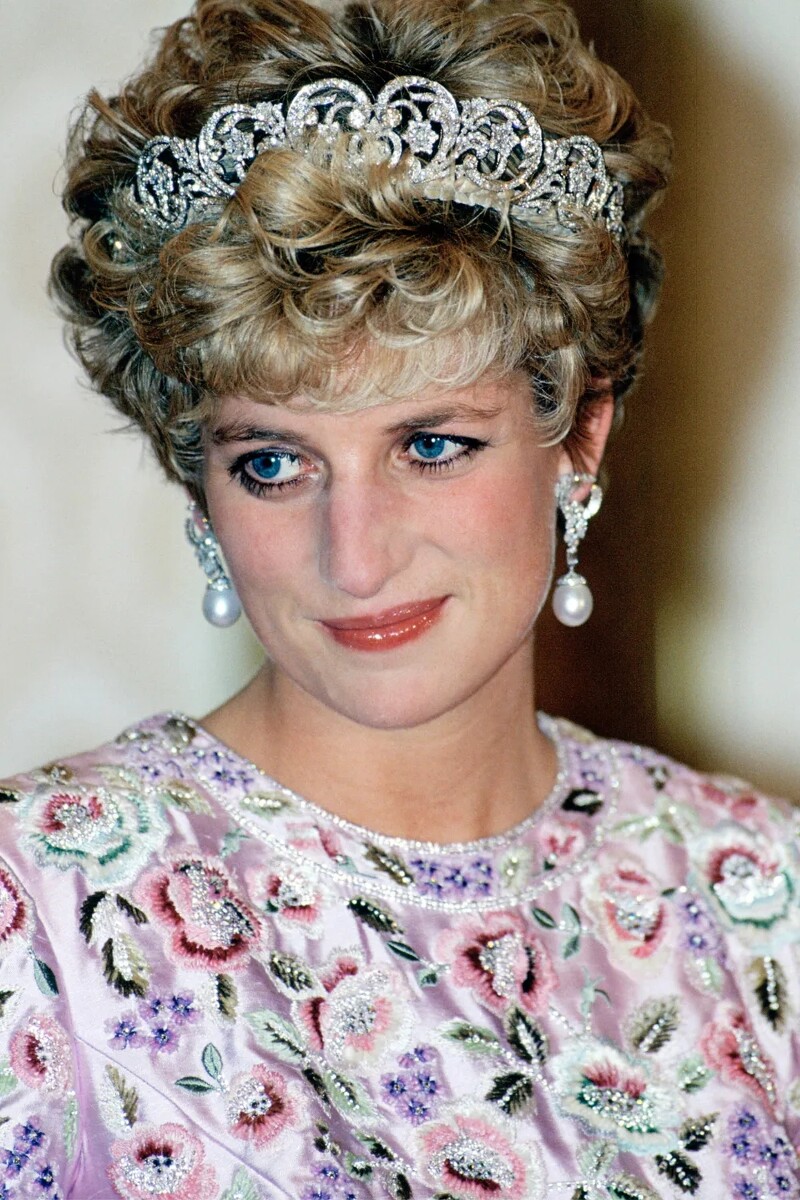 不得不说珍珠的皇冠和耳饰实在让人很难将焦点放在其他部分,不过黛安娜王妃的以轻盈华丽的捲髮做为搭配,虽然是捲髮却完全不显毛躁。