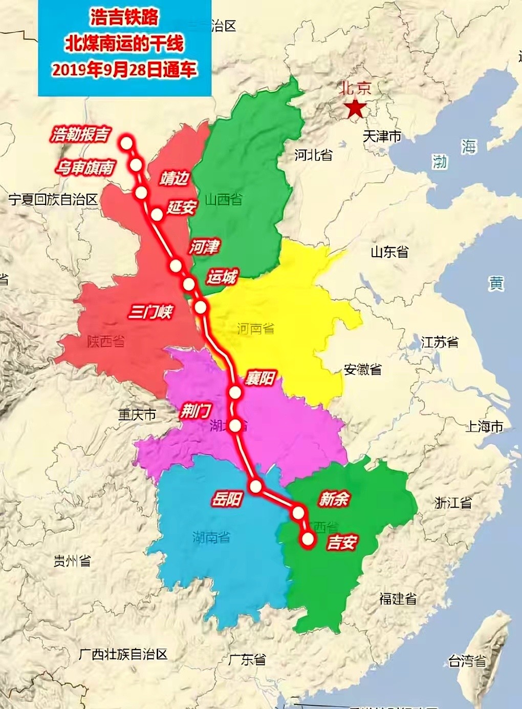 浩吉铁路从浩勒报吉一路南下,终点落在江西吉安。